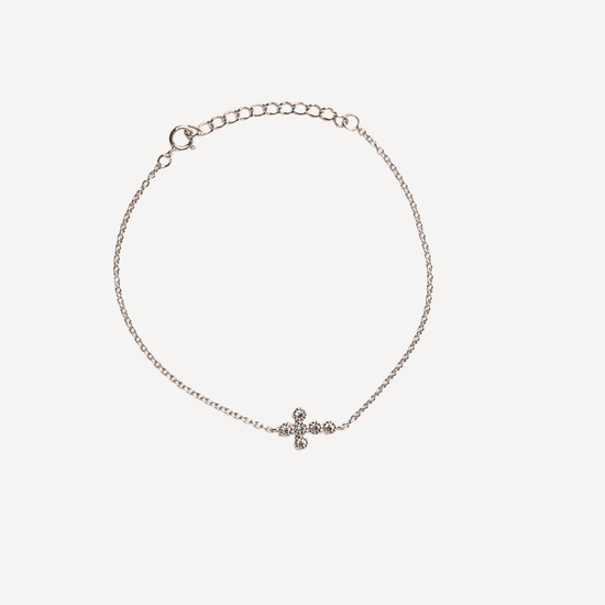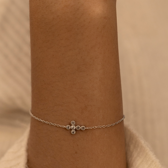Inspired by the purity and gentleness of agape love, this bracelet reinterprets the classic cross into a softened, modern silhouette. Each round-cut stone is thoughtfully arranged to form a radiant cluster that sits gracefully along the wrist.